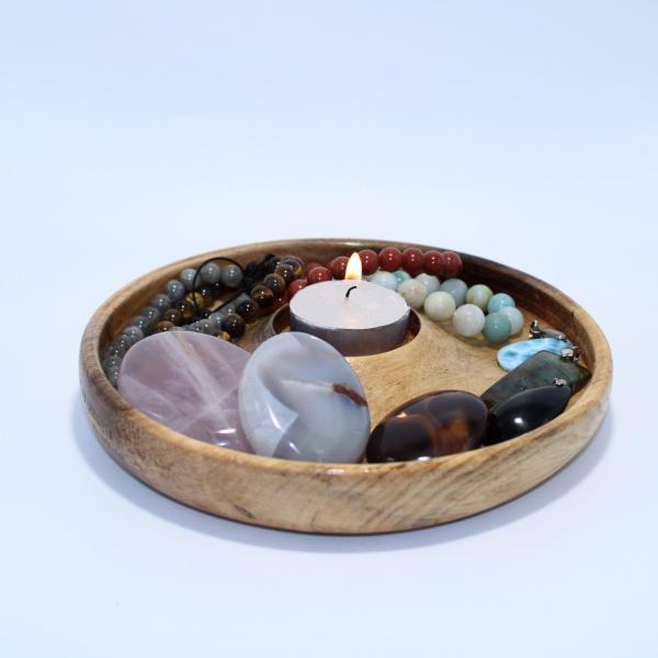 Pour toutes les personnes qui le souhaitent, je propose la coupelle de nettoyage énergétique. C'est une coupelle en bois, dont je sculpte les formes pour amplifier l’onde de forme incrustée, il peut également y avoir l’emplacement pour une bougie ou une pointe de Quartz des Alpes collectée par mes soins. Vous n’avez plus qu’à déposer vos bijoux ou minéraux à l'intérieur pendant une quinzaine de minutes.