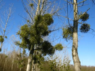 Le gui n’est pas un arbre, mais un sous-arbrisseau parasite poussant sur divers arbres tels que les pommiers, peupliers, aubépines, saules, tilleuls ou encore les chênes et ormes.
